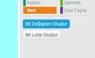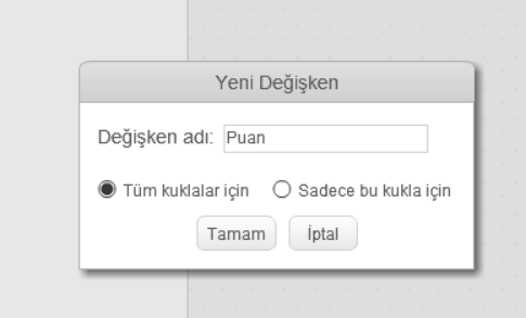 Son olarak bir puan değişkeni oluşturalım. Veri kısmından bir değişken oluştur diyoruz ve adını puan olarak belirliyoruz. Bu değişken Pico ağaçtan atladığında puan kazanmasını sağlayacak.